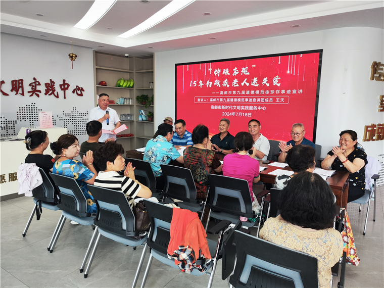 7月16日,高郵市新時代文明實踐服務中心開展文明實踐“點亮星夜”身邊好人事跡宣講活動。宣講員通過真摯樸實的語言,講述了高郵市第九屆道德模范徐珍存15年來為20多名殘疾老人免費上門理發的感人事跡。此次宣講活動,進一步發揮了身邊好人的榜樣引領作用,引導群眾以先進模范為榜樣,營造了崇德向善、見賢思齊的濃厚氛圍。