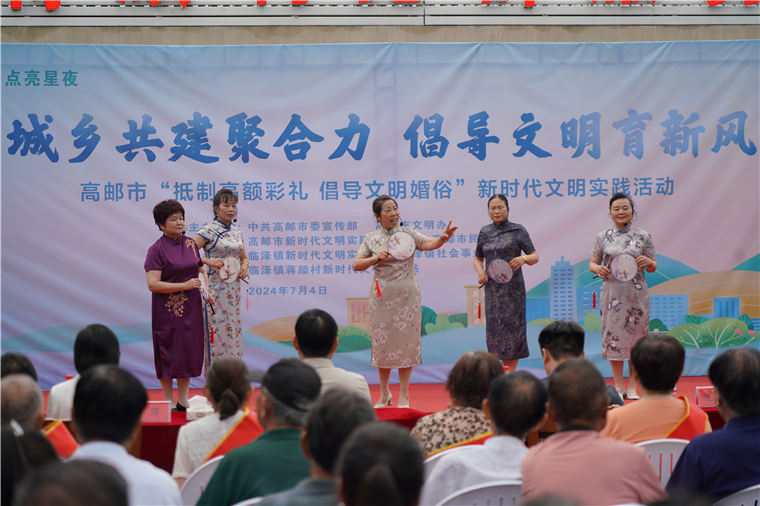 7月4日,文明實踐“點亮星夜”——高郵市“抵制高額彩禮?倡導文明婚俗”新時代文明實踐活動在臨澤鎮蔣顏村新時代文明實踐站成功舉辦。活動現場,揚劇說唱《“臨澤好人”紅娘說》、高蹺三句半《婚育新風進萬家》、表演唱《喜看臨澤好風光》、歌伴舞《文明婚俗就是好》等精彩節目目不暇接,讓群眾享受精神文化大餐的同時,進一步宣傳婚事新辦、喜事簡辦、拒絕高額彩禮、傳承優良家風等移風易俗新風尚。