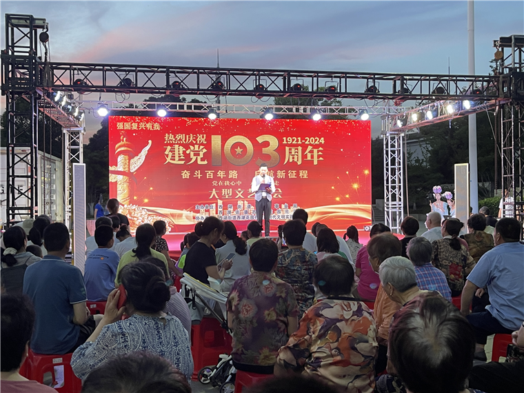 6月23日晚,揚州邗江區新時代文明實踐中心在西湖街道蜀岡生態體育公園內舉辦慶祝建黨103周年文藝演出,為轄區居民們呈現了一場精彩紛呈的視聽盛宴。各式各樣精彩紛呈的節目,以紅色文藝作品賡續紅色基因,激發了居民群眾愛黨愛國熱情。
