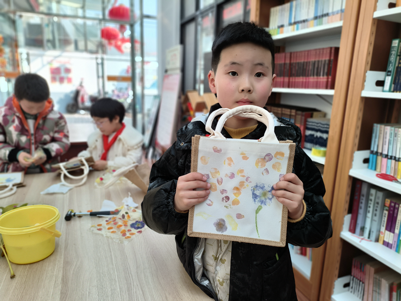 靖城街道玉皇殿社區開展拓染活動。孩子們認真聆聽志愿者的講解與指導,細細挑選中意的材料。有的孩子喜歡綠葉,寥寥幾片頗有詩意;有的孩子偏愛繁花,色彩繽紛絢爛活潑?!叭~瓣輕敲留印記,汁液滲透布紋嬌?!毙∧惧N輕輕敲打,植物的汁液便慢慢滲入棉布中,植物的脈絡一點點清晰展現,一幅幅意趣盎然的植物拓印畫躍然布上,留住了春天最美的樣子。