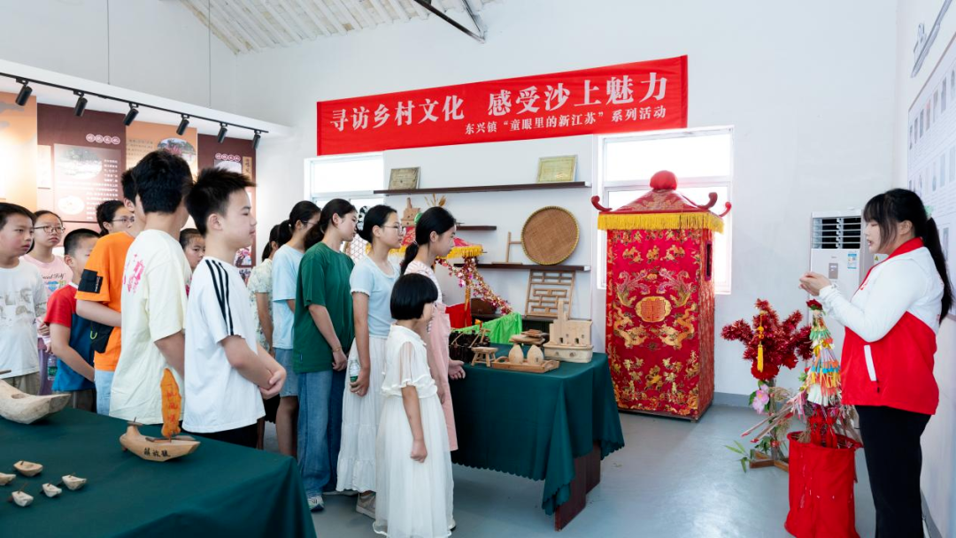 東興鎮新時代文明實踐所開展“童眼里的新江蘇”系列活動之“尋訪鄉村文化 感受沙上魅力”青少年主題尋訪活動。在沙上文化傳習室,講解員為孩子們講解了“人相習、代相傳”的沙上技藝、民俗,展示了老手藝人制作的鳳凰、花船、木雕等作品,讓孩子們沉浸式體會沙上文化的魅力。活動中,孩子們還領略了中國近代圖書館之父——繆荃孫的生平事跡、學術成就以及與東興結緣的軼事,了解了何德莊建成的前世今生。