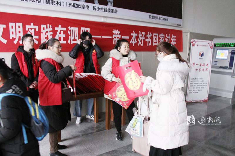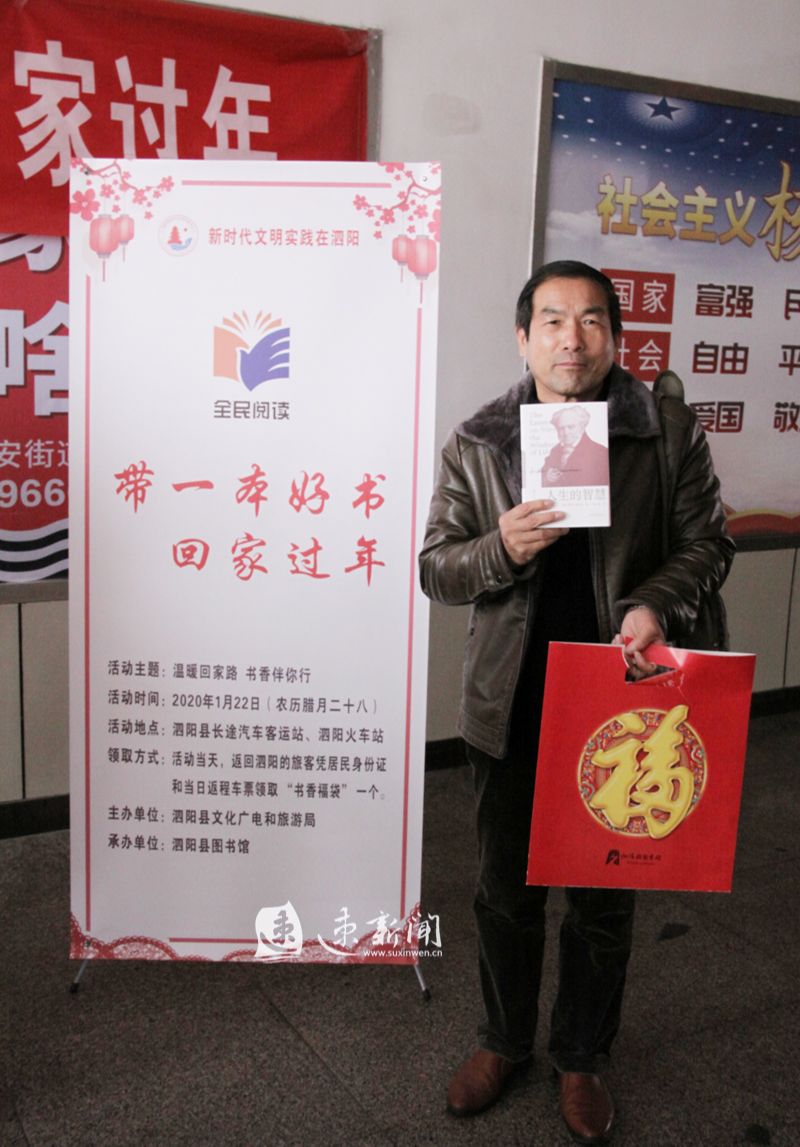 (速新聞記者 仲文路)“這本書真好!正好回家送給孩子看。”1月22日上午,在泗陽縣長途汽車客運站,從徐州乘車回到家鄉的陳先生拿到了一份“福袋”,拆開后發現,里面裝著圖書、春聯等禮品,拿著這份新年禮物,陳先生感到十分溫暖。