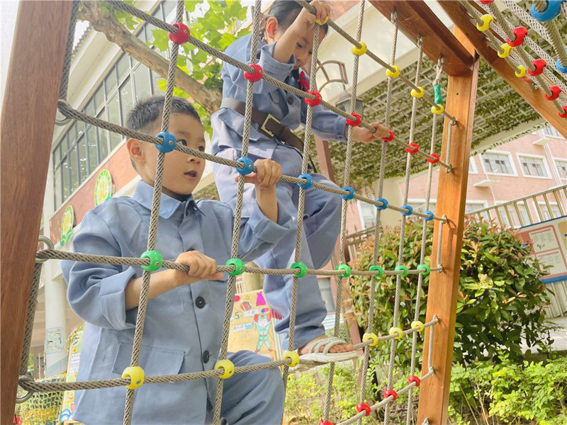 翻過高低起伏的山嶺、模擬紅軍飛奪瀘定橋和匍匐穿越敵占區、模擬革命烈士董存瑞舍身炸碉堡、多人合作搬運軍糧……孩子們感受革命先輩壯志豪情和人格魅力,體驗革命道路的艱辛與曲折,運動能力和身體素質得到提高的同時,堅強勇敢、積極樂觀、友好合作的品質也得到了歷練。