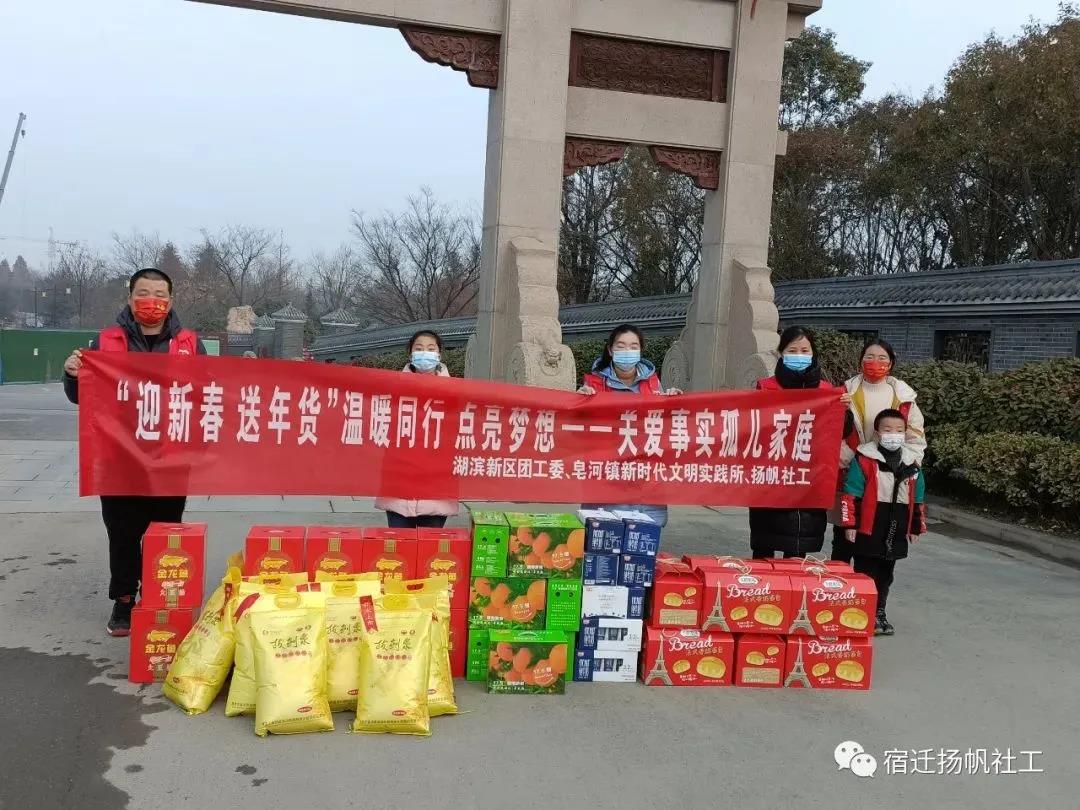 湖濱新區(qū)團(tuán)工委、皂河鎮(zhèn)新時(shí)代文明實(shí)踐所、揚(yáng)帆社工開展“迎新春 送年貨”溫暖同行 點(diǎn)亮夢(mèng)想——關(guān)愛事實(shí)孤兒家庭公益活動(dòng),為10戶貧困家庭送去大米、食用油、純牛奶、小面包、橙子,書包、文具等愛心年貨。