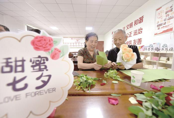 8月22日,正值七夕佳節(jié),由宿城區(qū)古城街道新苑社區(qū)婦聯(lián)、新苑社區(qū)新時代文明實(shí)踐站、古城街道社工站聯(lián)合舉辦的“攜手相伴 溫暖七夕”活動在新苑社區(qū)內(nèi)開展。現(xiàn)場,轄區(qū)內(nèi)的10對老年夫妻相聚一堂,互相介紹了自己的愛情故事,還一起制作花束送給對方,以這種別樣的形式歡度七夕。(記者 莊力瑋通訊員 李芳芳 攝)