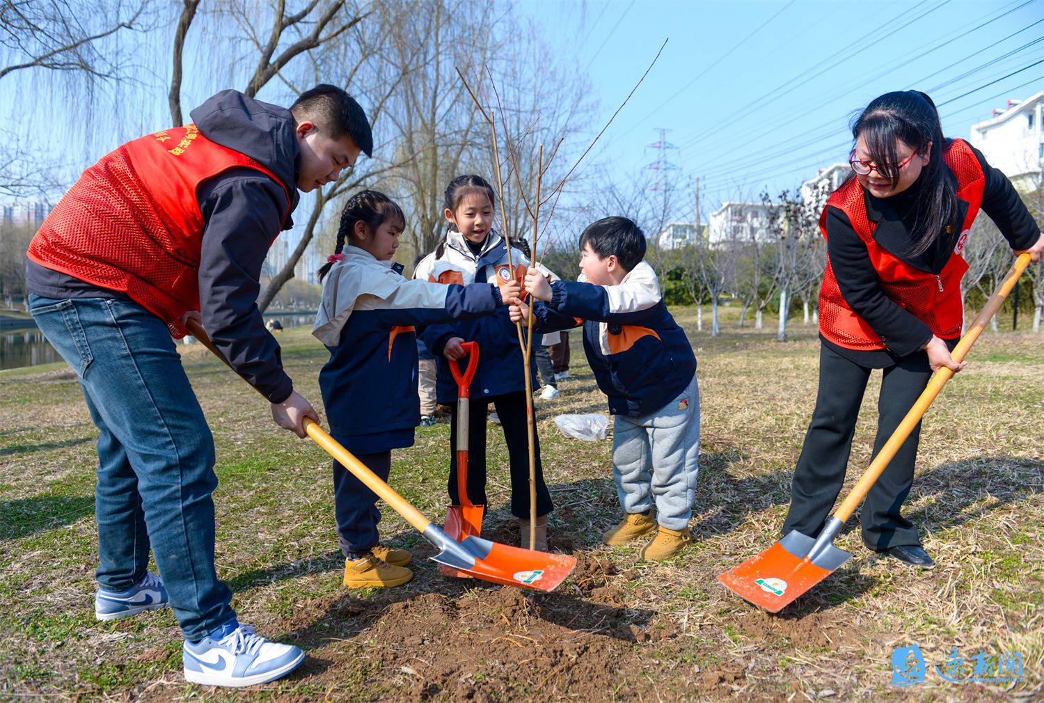 3月12日,宿遷經濟技術開發區黃河街道九鼎社區結合黨員冬訓活動,組織轄區內幼兒園小朋友到西民便河畔空曠處開展義務植樹活動,為河畔增添綠色,幫助小朋友從小樹立愛河護綠、保護生態的意識。