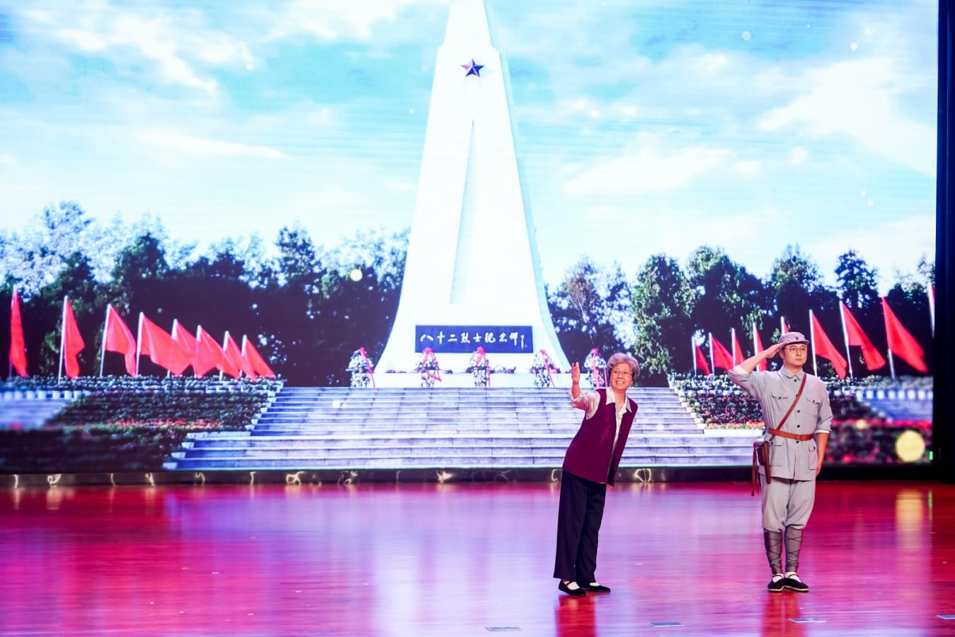 今年是中國人民抗日戰(zhàn)爭暨世界反法西斯戰(zhàn)爭勝利80周年。82年前,在江蘇淮陰劉老莊,82名新四軍戰(zhàn)士用生命掩護大部隊和群眾轉移,譜寫了一曲驚天地、泣鬼神的英雄壯歌。本場巡演中的情景詩畫《堅守》講述了劉老莊連指導員李云鵬烈士的妹妹,77歲的李愛云立誓守護烈士英魂的故事。舞臺上,兄妹倆跨越時空的對話,讓現(xiàn)場觀眾為之動容。