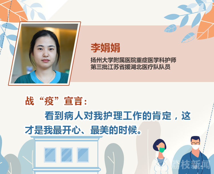 馳援武漢前,91年出生的李娟娟在揚州大學附屬醫院重癥醫學科已經工作了7年。新冠肺炎疫情發生后,她密切關注疫情動態。作為一名共產黨員,她告訴自己必須挺身而出,沖鋒在前。