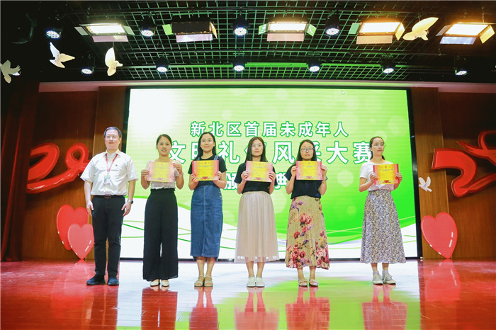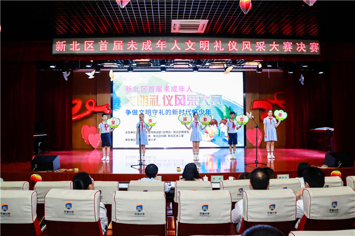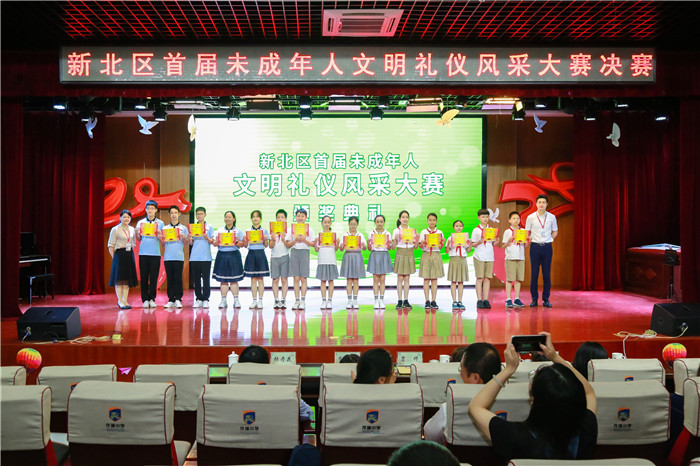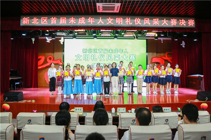 今年5月起,新北區委宣傳統戰部(文明辦)、新北區教育局、共青團新北區委、新北區婦聯、新北區關工委共同組織,廣泛發動全區所有小學、初中積極參與,經過激烈角逐,小學組8支隊伍、初中組4支隊伍站到了全區決賽的舞臺上。最終,常州市龍城小學、新北區龍虎塘中學分別獲得區級文明禮儀風采大賽小學組和初中組的一等獎,另有3所學校獲評二等獎、7所學校獲評三等獎。比賽期間,各參賽學校通過案例評審、風采展示、知識競答等生動活潑、豐富多彩的比賽形式,讓全區中小學生全面接受了八禮四儀養成教育和文明實踐,充分展示了全區青少年文明有禮、奮發向上的精神風貌。