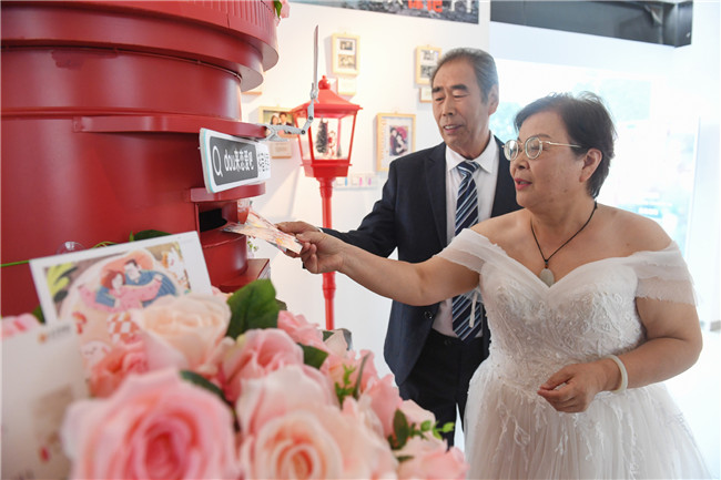 金婚老人寫下對(duì)另一半平時(shí)羞于表達(dá)的甜蜜情話,投遞到由南京愛(ài)情博物館、中國(guó)郵政江蘇分公司、花鄰打造“愛(ài)情郵筒”專屬網(wǎng)紅郵筒 本報(bào)記者 余萍攝