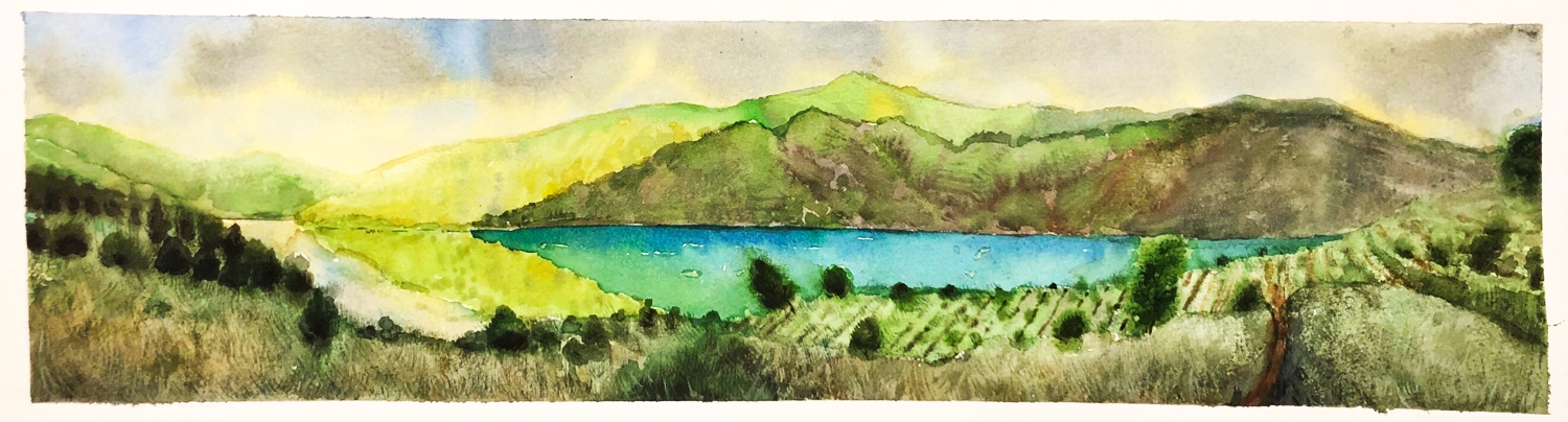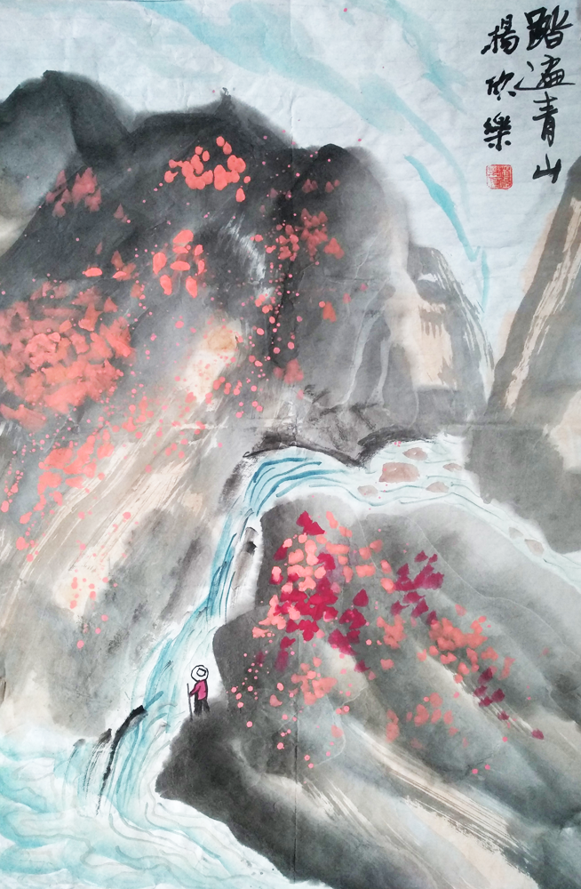 作品介紹:畫面描繪了家鄉(xiāng)美麗的河邊景色。綠水青山,秋高氣爽,景色怡人。