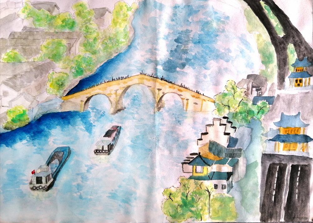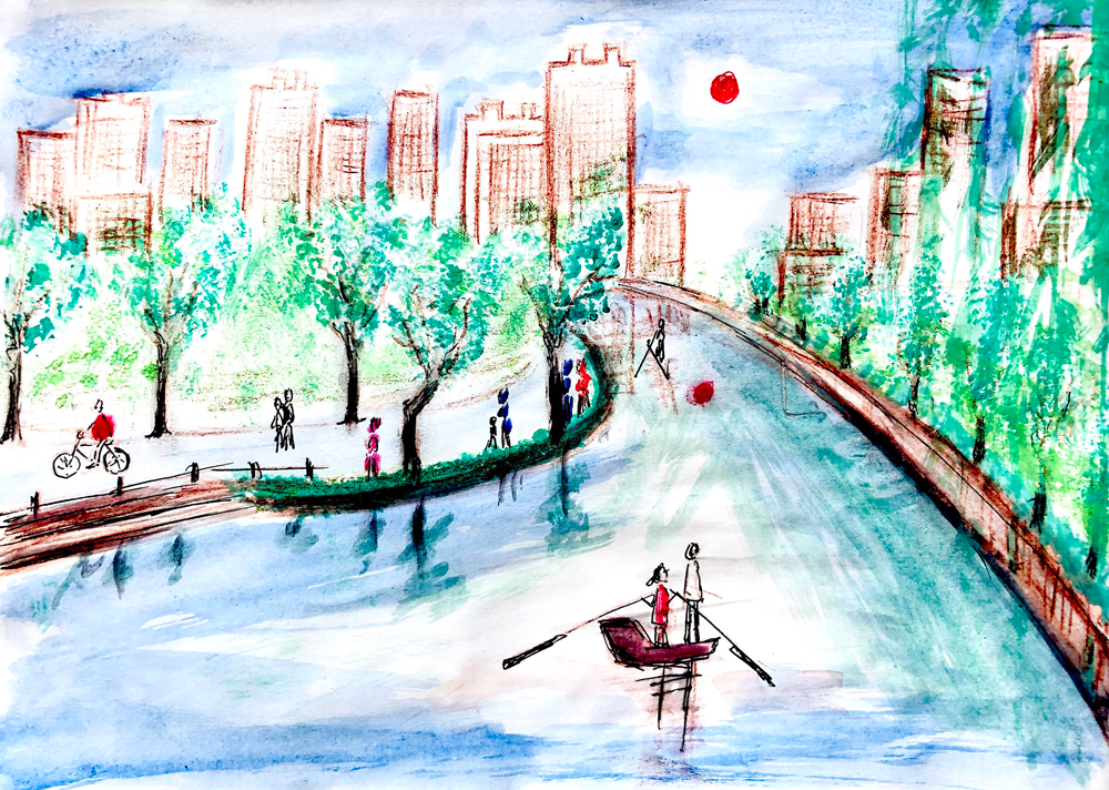 作品介紹:古老的運河是常州的母親河, 人文資源豐富, 名勝古跡眾多, 是一部承載常州歷史文化的寶典。運河孕育了我們,隨著歲月的變遷變得斑駁,如今,我們把滄桑的運河變得更美麗了,到處都是綠綠的樹、清清的水、姹紫嫣紅的花。瞧,一到傍晚,運河邊上圍滿了人,有釣魚的,有跳繩的,有跳廣場舞的……歡聲笑語熱鬧極了!
