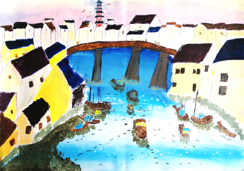 作品介紹:比起景色宜人的運河晨光,運河夜景更加引人入勝。每當夜幕降臨,月亮就會露出笑臉,星星眨著眼睛,一陣微風吹來,水面蕩起層層波紋,運河閃閃發(fā)光。小朋友們來到運河河畔,有的欣賞著對岸的風景,有的討論著來往的游船,還有的伴隨著音樂跳起了舞。整個運河邊都回蕩著歡聲笑語,洋溢著歡快的氣氛。