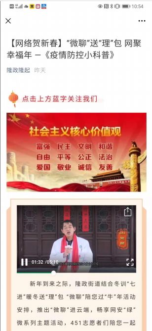 微聊潤心,打造理論學習“加油站”。圍繞黨的十九屆五中全會精神和市委第十三屆十次全會精神,按照黨員冬訓的各項工作部署,用老百姓聽得懂的話,說老百姓愿意聽的理,從群眾關注熱點、社會關注焦點為“宣講點”,發揮“一村一品一代言”示范效應,組織開展微聊進機關,凝心聚力“紅”、微聊進集鎮,牽手文明“藍”、微聊進家庭,匯聚和睦“橙”、微聊進車間,托起發展“金”、微聊進書屋,傳承文化“青”、微聊進田頭,共話豐收“黃”、微聊進云端,暢享網安“綠”七大主題,開展“七進+七彩”“微聊”宣講示范活動,打造理論宣講“電磁波”,推動黨的創新理論“飛入尋常百姓家”。截至目前已組織開展宣講20余場,覆蓋近萬人。