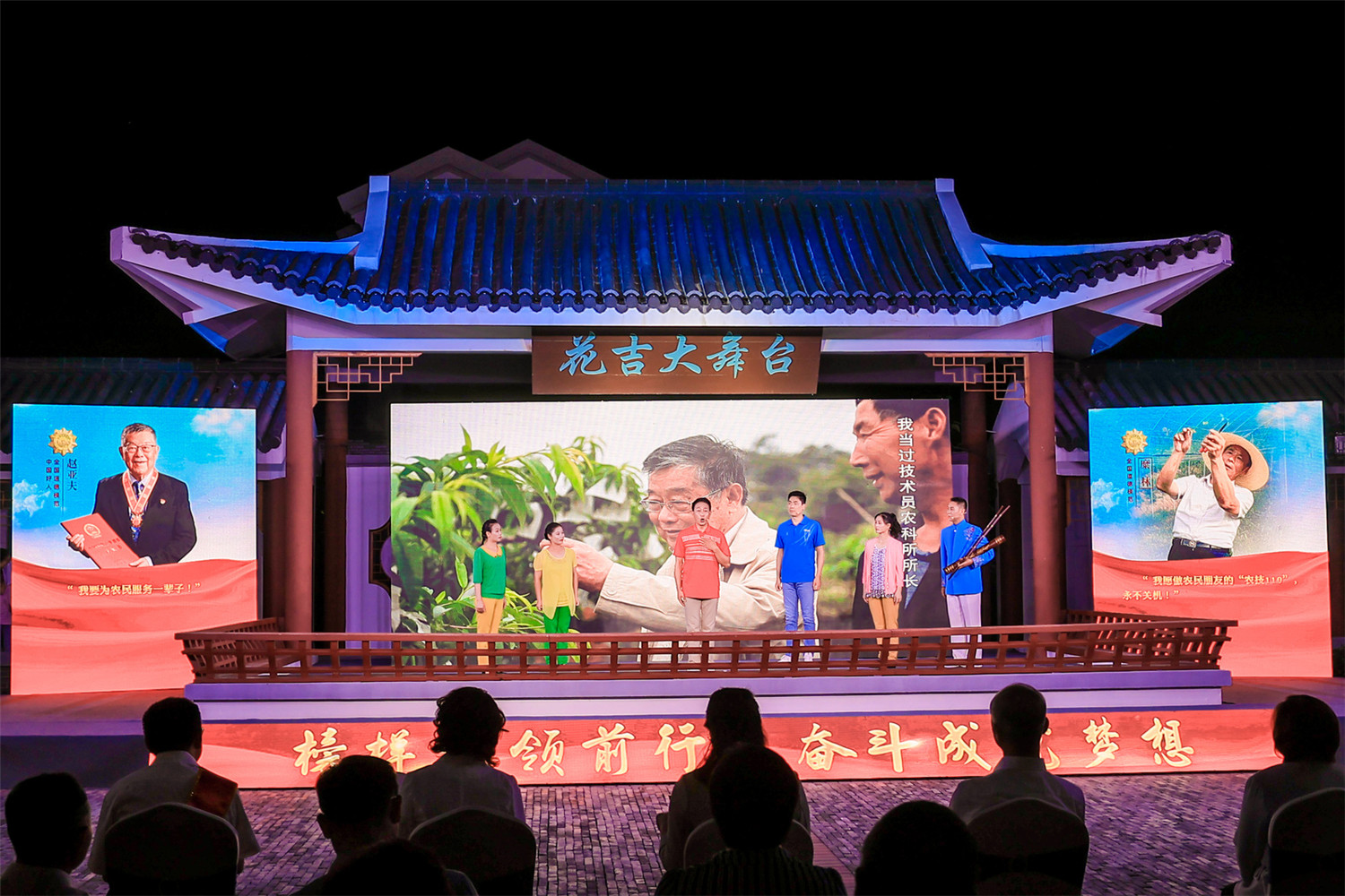 “趙老,我們農民謝謝您!糜主任,我們農民不忘您!”舞臺上,表演者手捧著金燦燦的水稻、紅艷艷的草莓以及各種豐收的農產品,深情講述了全國道德模范趙亞夫和糜林的感人事跡。他們扎根農業一線,把成績寫在大地上,把成果留在農民家?!八麄冋f,再貧瘠的土地也能種出夢想、種出太陽!”清曲說唱《土地情深》深情贊頌了這對師徒為農民服務一輩子的高尚品質。