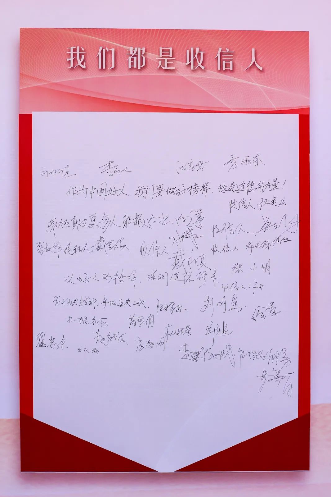 9月6日晚下午5點多,50多位句容當地的道德模范和身邊好人陸續來到現場,紛紛在“我們都是收信人”的展板前留下了自己的心聲。“中國好人”孫建云,從教師崗位退休后依然從事家校共建的志愿工作,看到眾多身邊好人的事跡,她動情地在留言板上寫道:“作為中國好人,我要做好榜樣,傳遞道德的力量”。“江蘇好人”芮東明是一位葡萄種植專家,他用“學習亞夫精神,爭做亞夫二代”表達了自己扎根農業的決心。