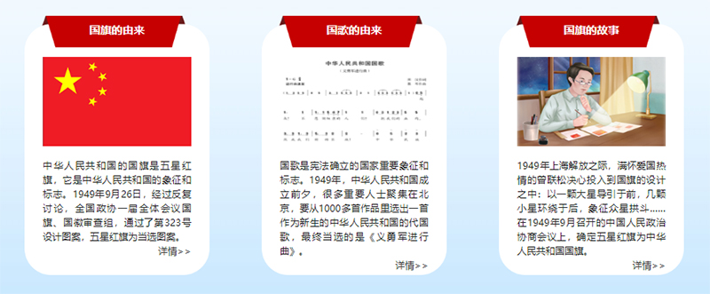 “向國旗敬禮”活動不僅僅是一種儀式,更是一次愛國主義教育。作為行之有效的愛國教育實踐活動,已連續多年收獲廣大青少年參與。為了讓孩子們更多地了解到國旗、國歌的來歷,專題中做了國旗的由來、國歌的由來、國旗的故事等內容版塊,在網上開設“德育大課堂”,進一步增強孩子們的國家觀念、弘揚愛國主義精神。