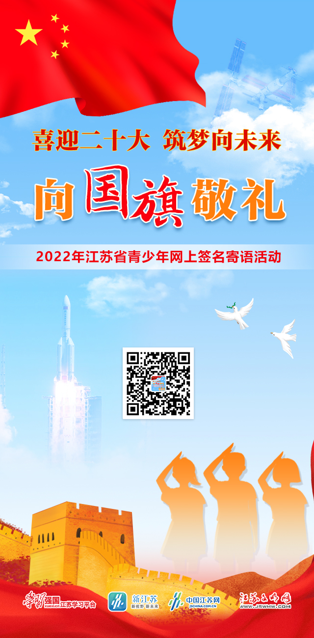 本次“向國旗敬禮”網上簽名寄語活動時間為9月30日至10月10日,中國江蘇網·新江蘇客戶端、文明江蘇微信公眾號、江蘇文明網均設有活動入口。希望廣大青少年借助活動平臺,積極參與,充分展現新時代青少年愛黨愛國的熱情,爭做德智體美勞全面發展的強國復興接班人,以實際行動迎接黨的二十大勝利召開。