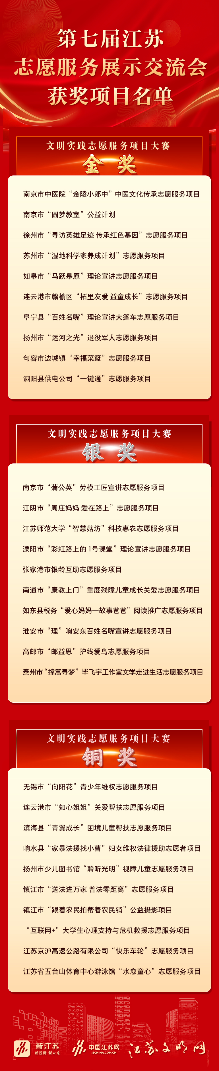 為推動促進志愿服務項目組織實施水平的提升,第七屆江蘇志愿服務展示交流會文明實踐志愿服務項目大賽經過現場角逐,評選出金銀銅獎項目,現予以公布。