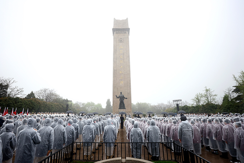 清明前夕的雨花臺烈士陵園內煙雨空蒙、蒼松疊翠、靜穆莊嚴。烈士紀念碑巍峨高聳,“寧死不屈”的革命烈士塑像前,寓意革命精神薪火相傳的“長明燈”熊熊燃燒、生生不息。參加活動的省市相關部門負責同志、南京市中小學師生以及各有關方面代表,在烈士紀念碑前列隊等候。活動在全場齊聲高唱中華人民共和國國歌中正式開始,雄壯的國歌聲響徹雨花山崗。隨后,大家莊嚴肅立,向為中國人民解放事業和共和國建設事業英勇獻身的烈士默哀。