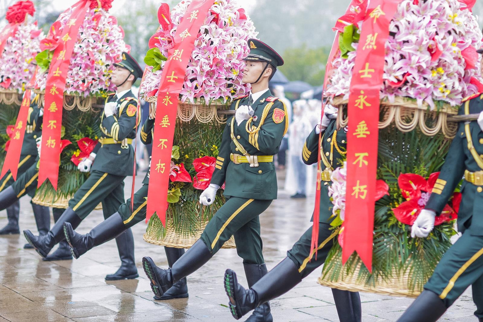 伴隨著凝重深沉的《獻花曲》,來自南京信息職業技術學院國旗班的14名學員托起各界代表敬獻的7只花籃,邁著整齊有力的步伐,緩緩走向紀念碑,將花籃擺放在革命烈士塑像前。