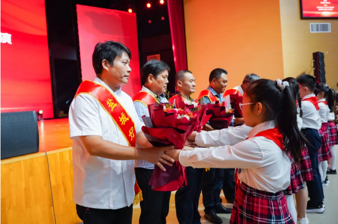 演出開始前,“中國好人”卞康全、“江蘇好人”柏志全等10位來自鹽城經濟技術開發區的先進典型在現場觀眾熱烈的掌聲中接受了學生代表為他們獻上的鮮花。
