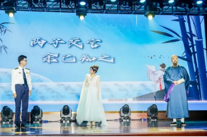 解決群眾“急難愁盼”,護航江海高質量發展,是江蘇海事人扛在肩上的責任,更是刻在心中的使命。本場演出中的情景劇《一枝一葉總關情》是由泰州海事局職工本色出演,講述的是海事執法人員在穿越古今的“小水滴”的帶領下,見到了這首詩的作者鄭板橋,由板橋先生的“堅、清、情”為官之德,講述了海事部門心系民生冷暖的真摯情懷。