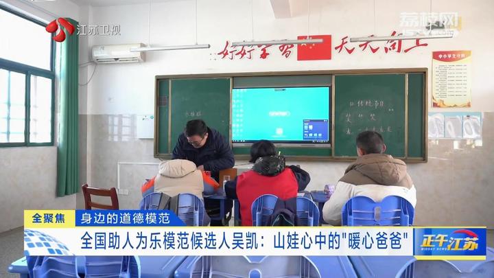 2002年,吳凱從師范學院畢業后來到盱眙縣仇集山區當老師。2011年,一場車禍使吳凱失去了左腿。他戴上假肢,忍痛走上講臺并堅持站著給孩子們上好每一節課。扎根農村中學任教20余年,他為留守學生免費提供周末托管服務,發起實施“山爸山媽”關愛留守兒童志愿服務項目,先后認領54個留守山娃,并為學校300余名留守山娃結對了52位“山爸山媽”。該項目2019年在盱眙縣推廣,至今已組建“愛心家庭”5000多個,惠及留守兒童近7000名。