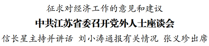 近日,中共江蘇省委召開黨外人士座談會,就我省今年經濟形勢和明年經濟工作聽取各民主黨派省委會、省工商聯負責人和無黨派人士代表意見建議。省委書記信長星主持座談會并講話。省委副書記、省長劉小濤通報全省經濟工作有關情況,介紹明年經濟工作有關考慮。省政協主席張義珍出席。