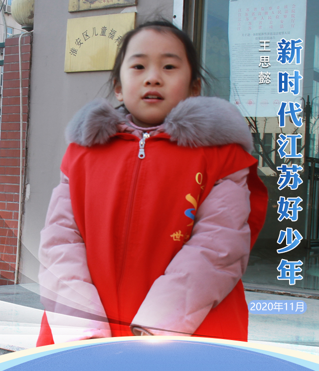 王思懿,女,2011年9月出生,淮安市關(guān)天培小學(xué)三(10)班學(xué)生。王思懿是淮安區(qū)世紀(jì)愛心服務(wù)隊(duì)最小的志愿者,殘疾人康復(fù)中心、福利院都留下了她參與公益活動(dòng)的身影。“居家防疫”期間,她自編自演順口溜《宅在家里學(xué)文化》和《防疫情三字經(jīng)》,并請(qǐng)家人拍成視頻通過抖音、微信朋友圈廣泛傳播,得到老師、同學(xué)及鄰居們的夸贊。今年暑假,她主動(dòng)組織社區(qū)留守兒童開展“讀國學(xué)、誦經(jīng)典”讀書活動(dòng),積極參與世紀(jì)愛心服務(wù)隊(duì)“紅領(lǐng)巾”中隊(duì)的各類志愿服務(wù)活動(dòng)。王思懿的爺爺王賢忠是一名“中國好人”,她希望能像爺爺一樣,用自己的力量幫助更多需要幫助的人。