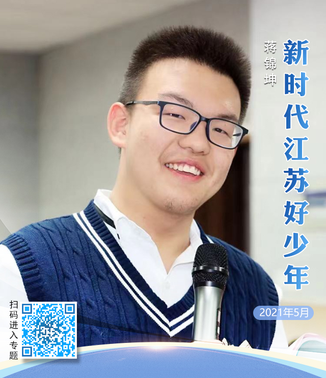 蔣錦坤,男,2006年5月出生,鹽城景山中學初三(6)班學生。蔣錦坤陽光開朗、品學兼優,每學期都被評為校“三好學生”“優秀班干部”。身為班級政治和歷史課代表,他將鹽城128個以革命烈士命名鎮村的紅色故事,編印成小冊子分發給同學們,并為大家講述曾經生活、戰斗、犧牲在鹽阜大地的抗日英烈感人事跡。蔣錦坤熱心公益、樂于助人,他積極參與“紅色大講堂——我是紅色故事傳承人”等活動,為參觀新四軍紀念館的游客義務講解30余場;主動參與文明城市創建、“愛心伴我行”、“童夢圓”等公益活動,組織同學們看望孤寡老人,為貧困兒童捐贈課外書籍500余本。他表示自己會一直堅持做公益,用實際行動爭做“鐵軍精神”的傳承者、弘揚者。