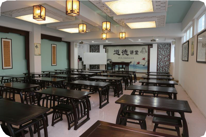 道德講堂在一般情況下由“唱歌曲、學模范、誦經典、發善心、送吉祥”五個主要環節組成,也可根據講堂主題適當進行調整, 但基本程序應得到保證,各環節要充分體現儀式感。